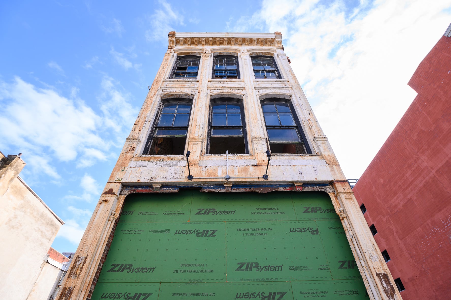 A historic, cast-iron façade of the old Cooper’s Home Furniture store at 212 North Market Street Wilmington served as the centerpiece of a groundbreaking today for what soon will be a contemporary 92-unit apartment building.